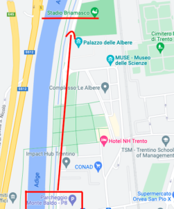 - Uscire dall’autostrada al Casello di Trento Sud e, alla rotonda, prendere la prima uscita e raggiungere la seconda rotonda dopo aver percorso il ponte sull’Adige